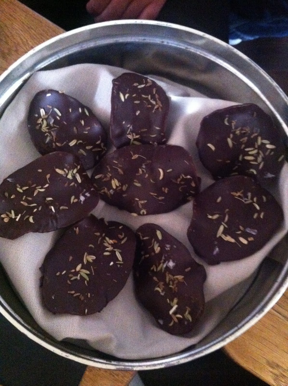Kartoffleskiver overtrukket med mørk chokolade, strøet med fennikelfrø.